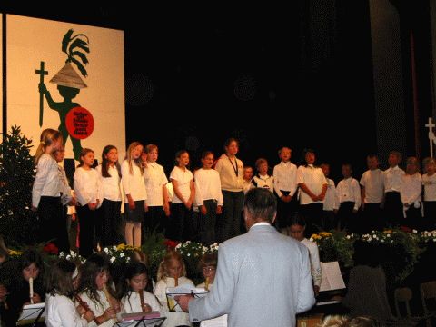 Konrektor Zöllner mit dem Chor und der Orff-Gruppe